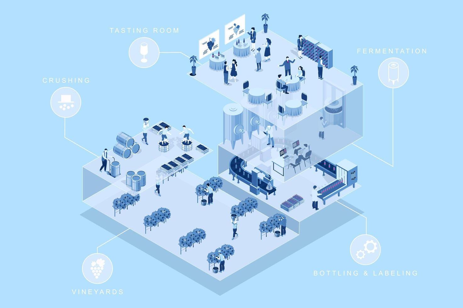Winery factory 3d isometric concept for web design. People in isometry working at vineyard, crushing, fermentation, bottling and labeling wine bottles, tasting vine beverage. illustration. Pro Vector