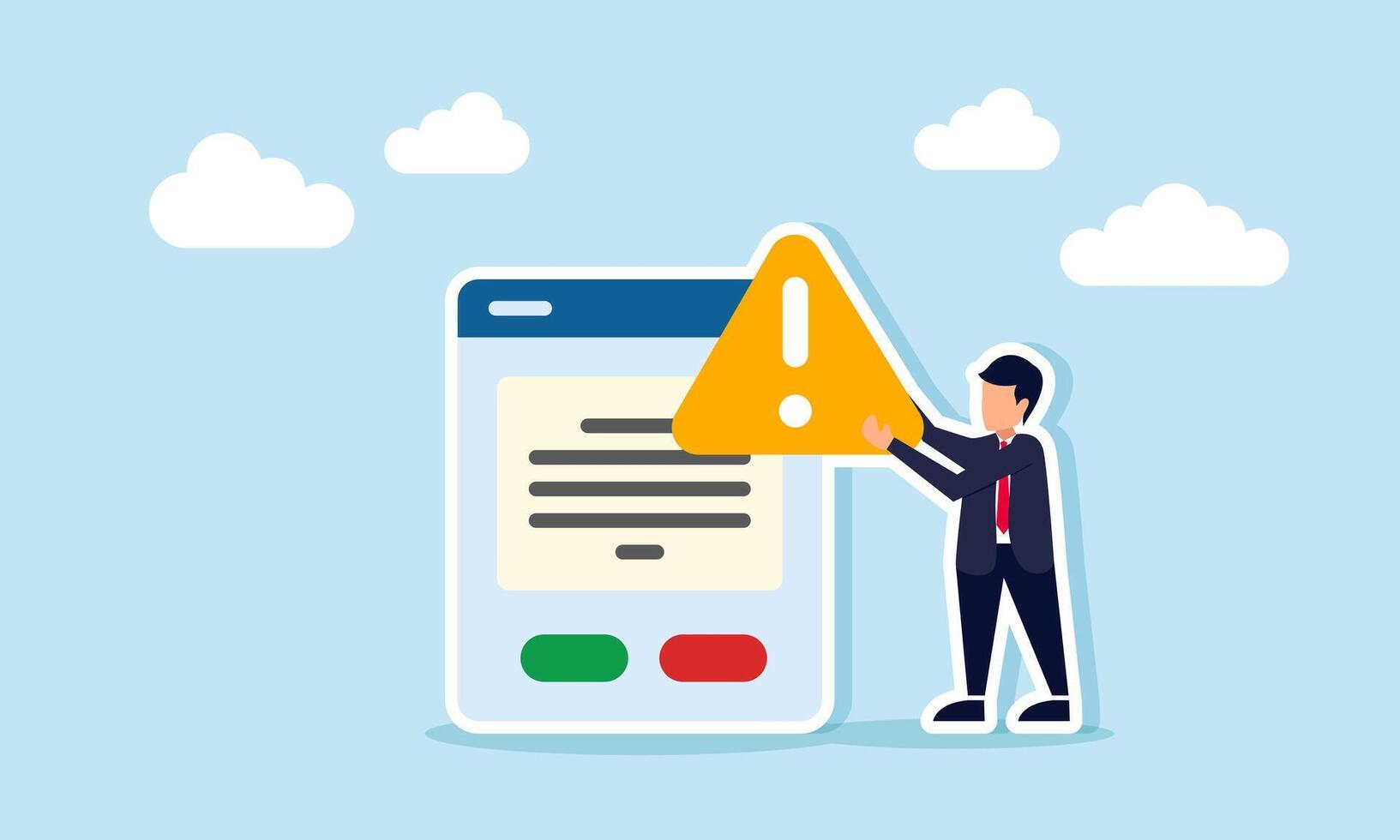 businessman giving an exclamation mark or alert on an app interface, illustration of warning about risky misuse of a business application Pro Vector