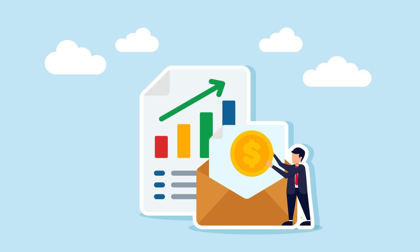 businessman carrying a dollar coin beside a chart report and an envelope containing paper documents, illustration of improving company business financial performance over periods Pro Vector