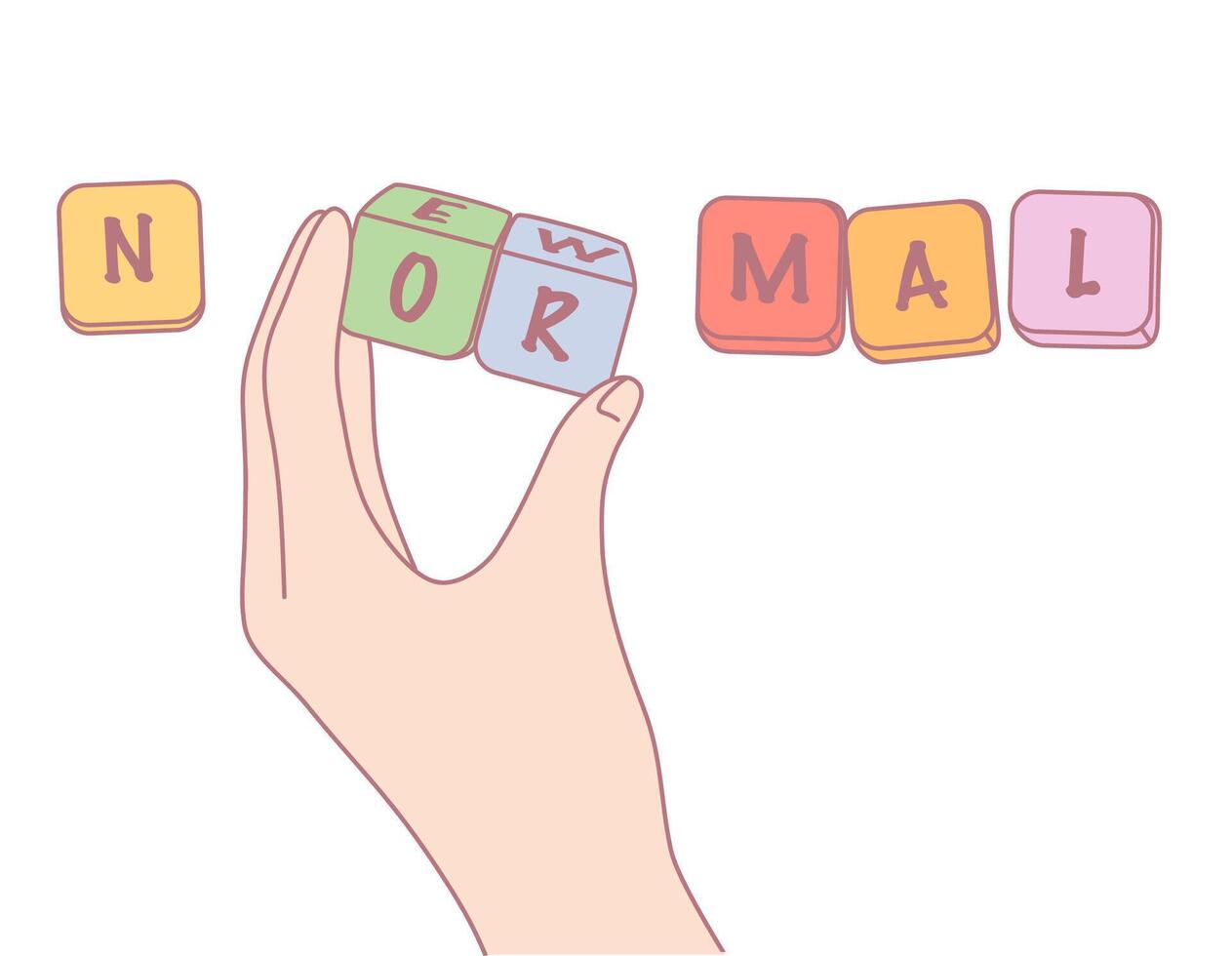 A hand is holding building blocks that are spelling out the word NORMAL in a fun way Pro Vector