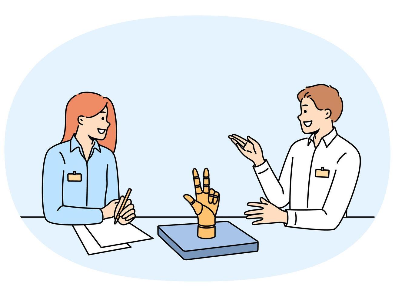 Meetings of office employees discussing robotization of production, sitting at table with robot arm Pro Vector