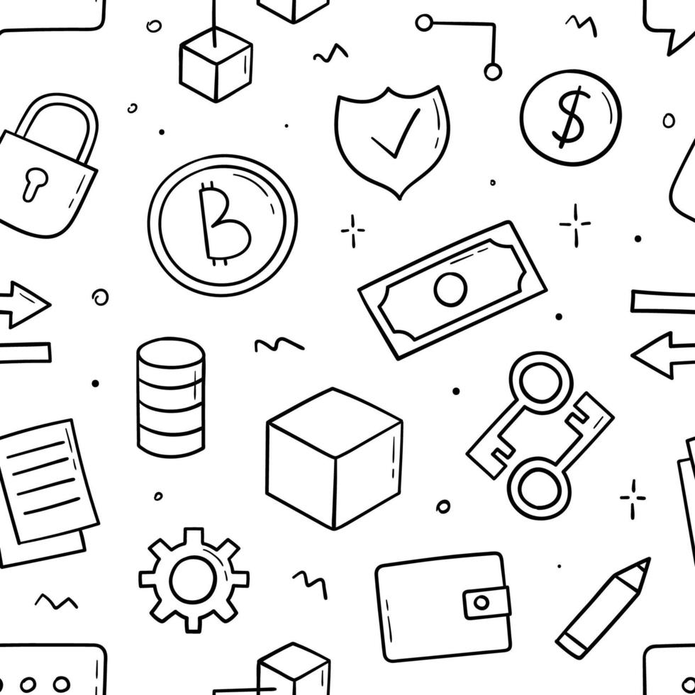 Hand drawn seamless pattern of blockchain elements, cryptocurrency, bitcoin. Doodle vector illustration for background design. Pro Vector