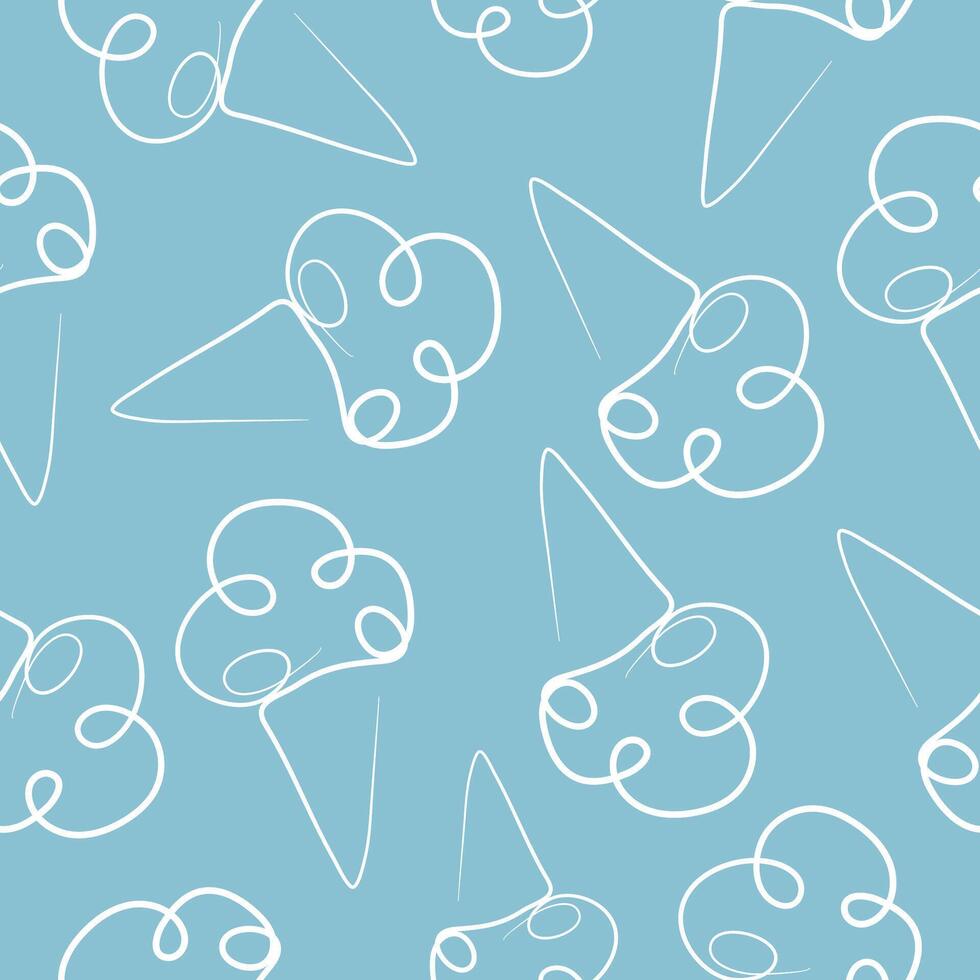 seamless pattern with simple icons of a cone with three scoops of ice cream in line art style drawn with one contour on a blue background Pro Vector