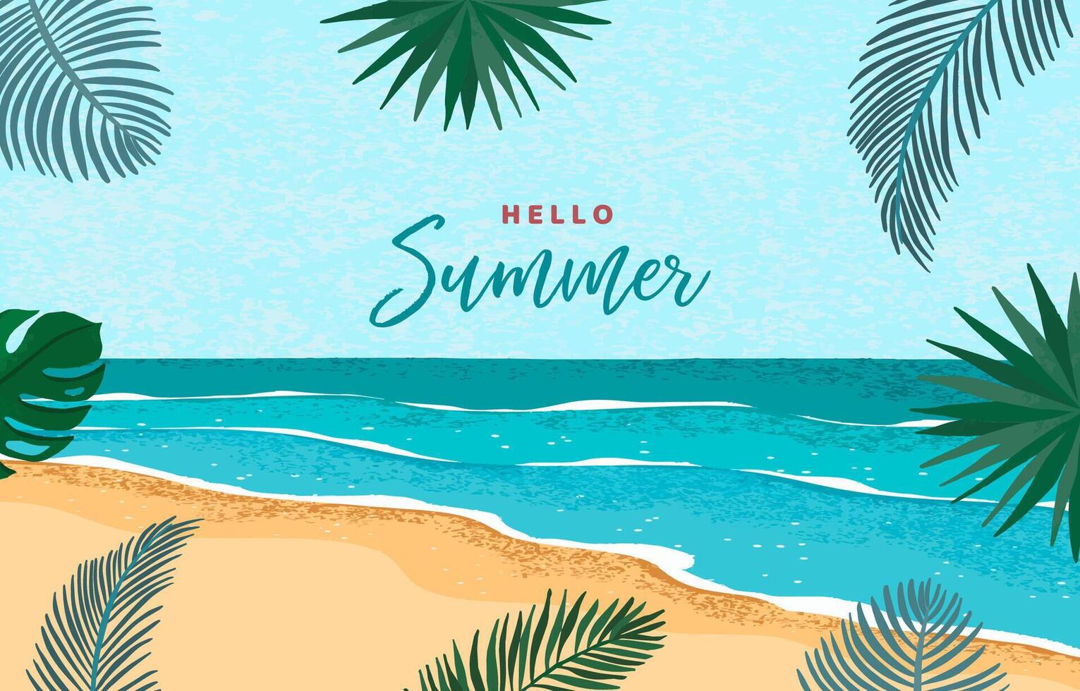 Hello summer background with palm leaves frame for horizontal design Pro Vector