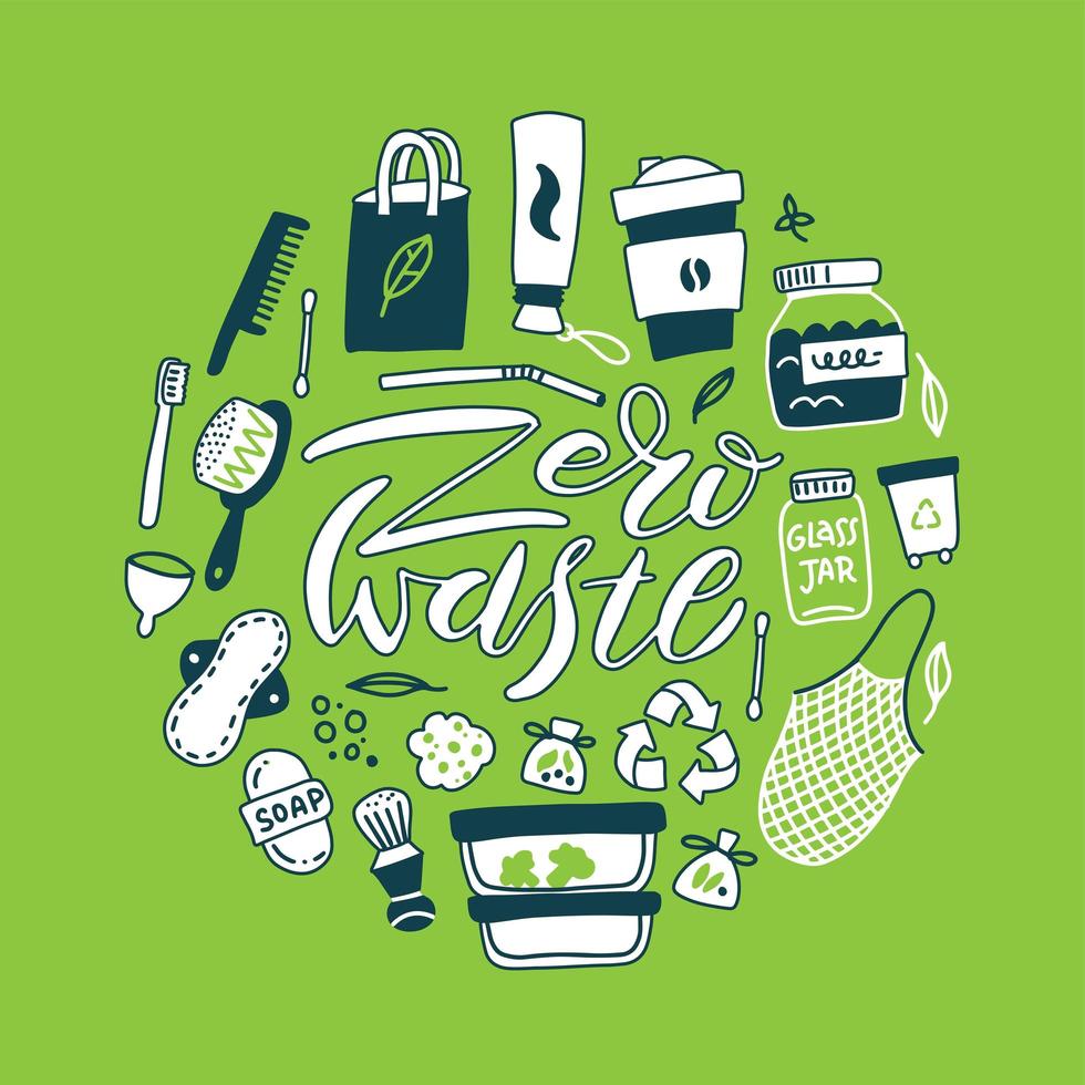 Zero Waste lettering with elements set in round shape. Linear icons of Reduce Reuse Recycle in circle form. Eco lifestyle sign and symbol collection. Hand drawn vector illustration on green background Pro Vector