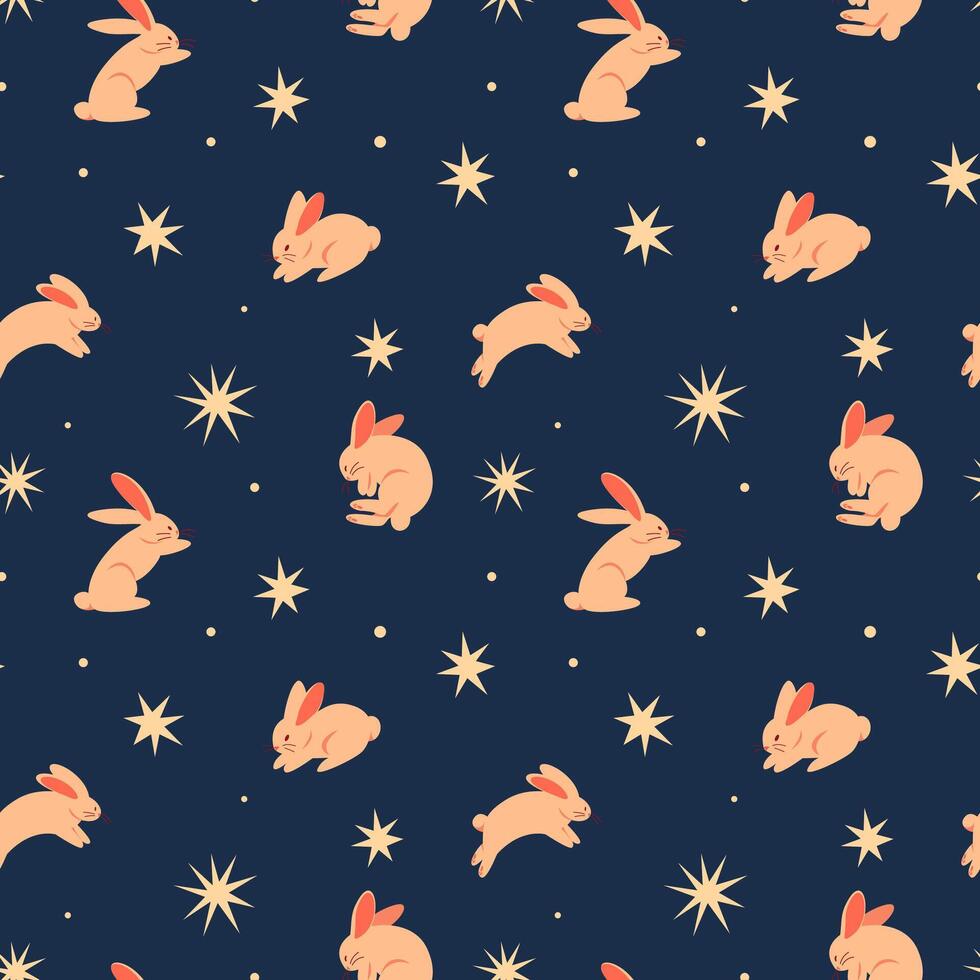 Cute seamless pattern with delicate rabbits on a dark background with stars. Suitable for wrapping, textiles, packaging, backgrounds Pro Vector