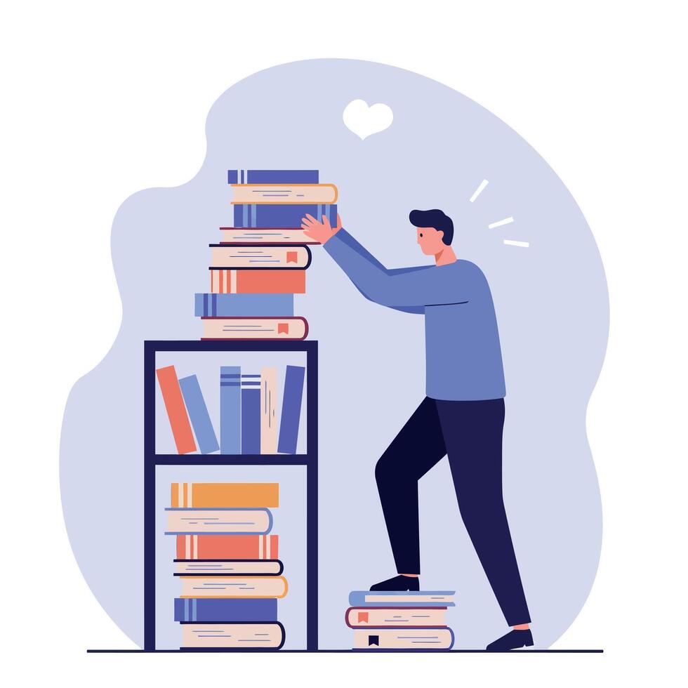 Man organizing tall stack of books on shelf in flat minimal style focused on learning and order illustration Pro Vector