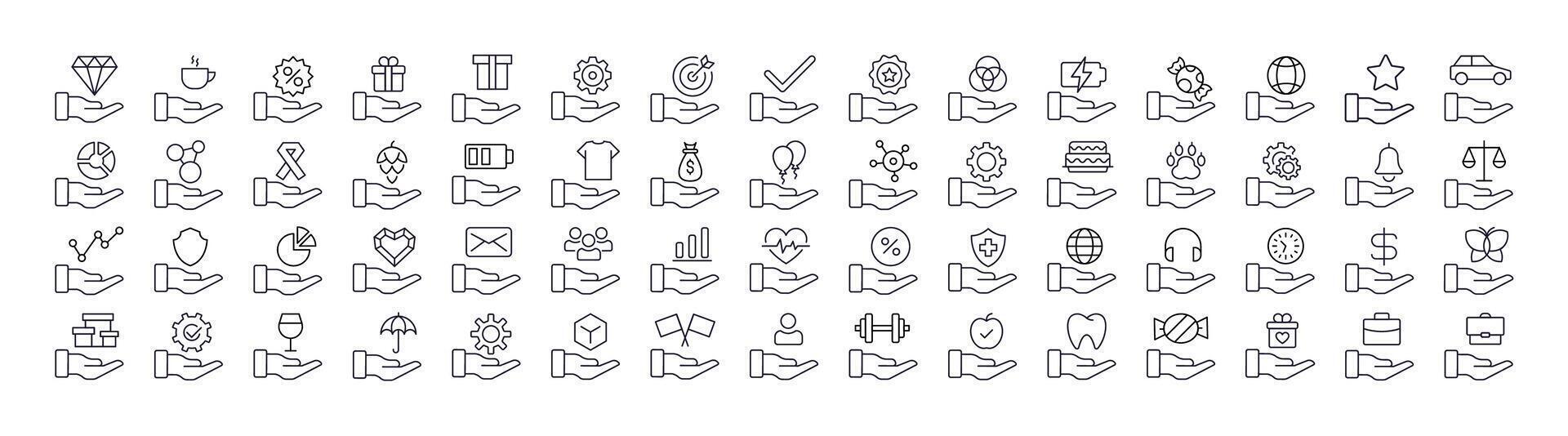 Different Items on Hand Thin Line Icon Set. Outline Signs for Graphic and Web Design, Apps, Adverts, Various Cards Pro Vector
