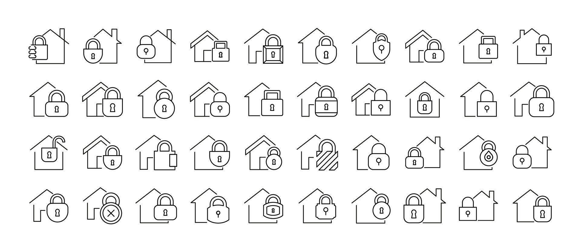 Set of Line Icons of House with Lock. Minimalistic Linear Pictogram for Web and Graphic Design, Apps, Banners, Social Network and Cards Pro Vector