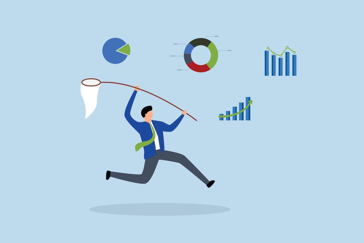 Collect data, businessman catch data graph and chart with butterfly net. Pro Vector
