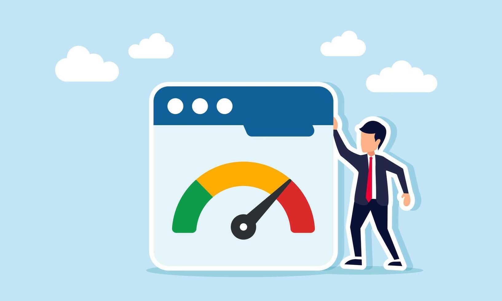 Businessman standing beside an app interface displaying a speedometer indicator, illustration of digitally and online monitoring business performance in real-time Pro Vector