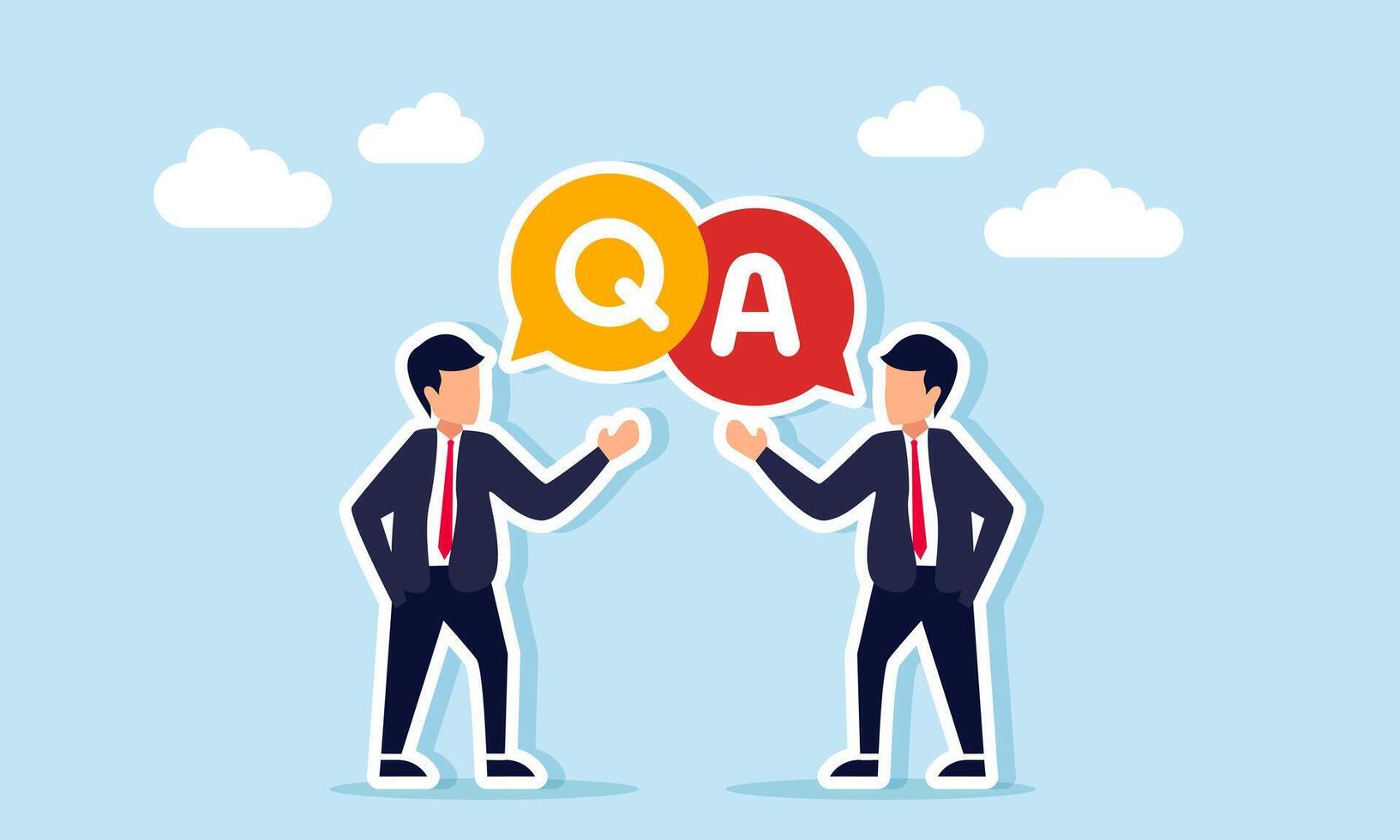Two businessmen talking to each other with a chat dialog icon showing Q and A labels, illustration of a Q A or sharing session in a business setting Pro Vector
