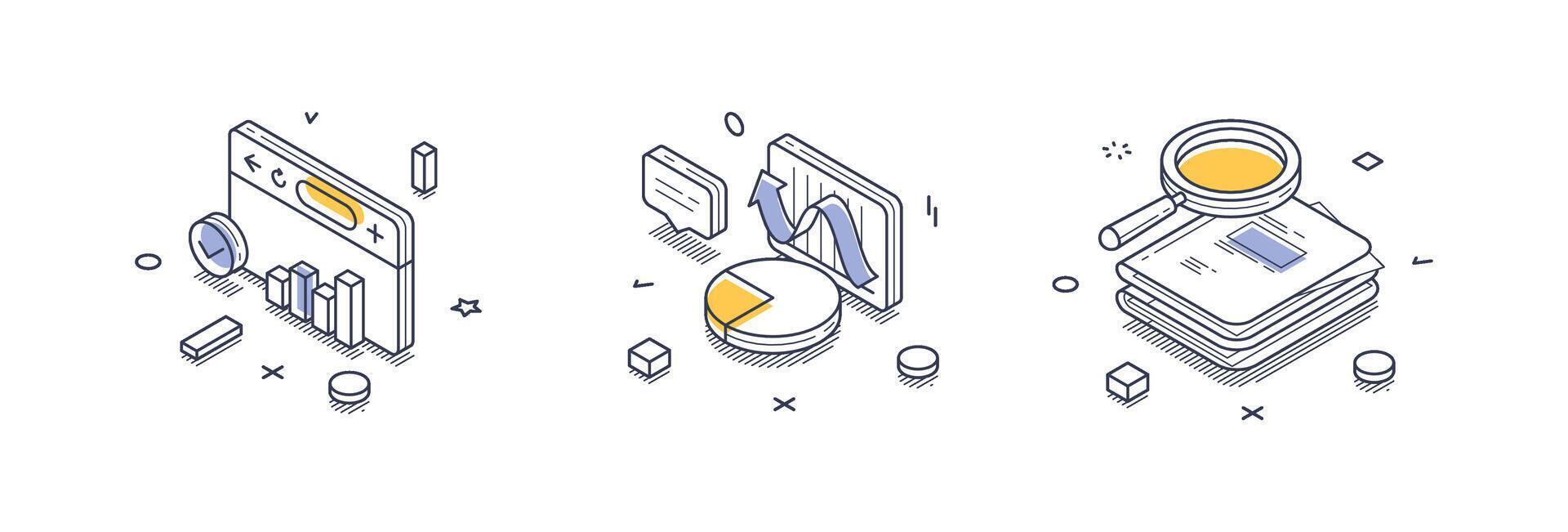 Modern isometric line icons representing data analysis concepts and infographics design Pro Vector