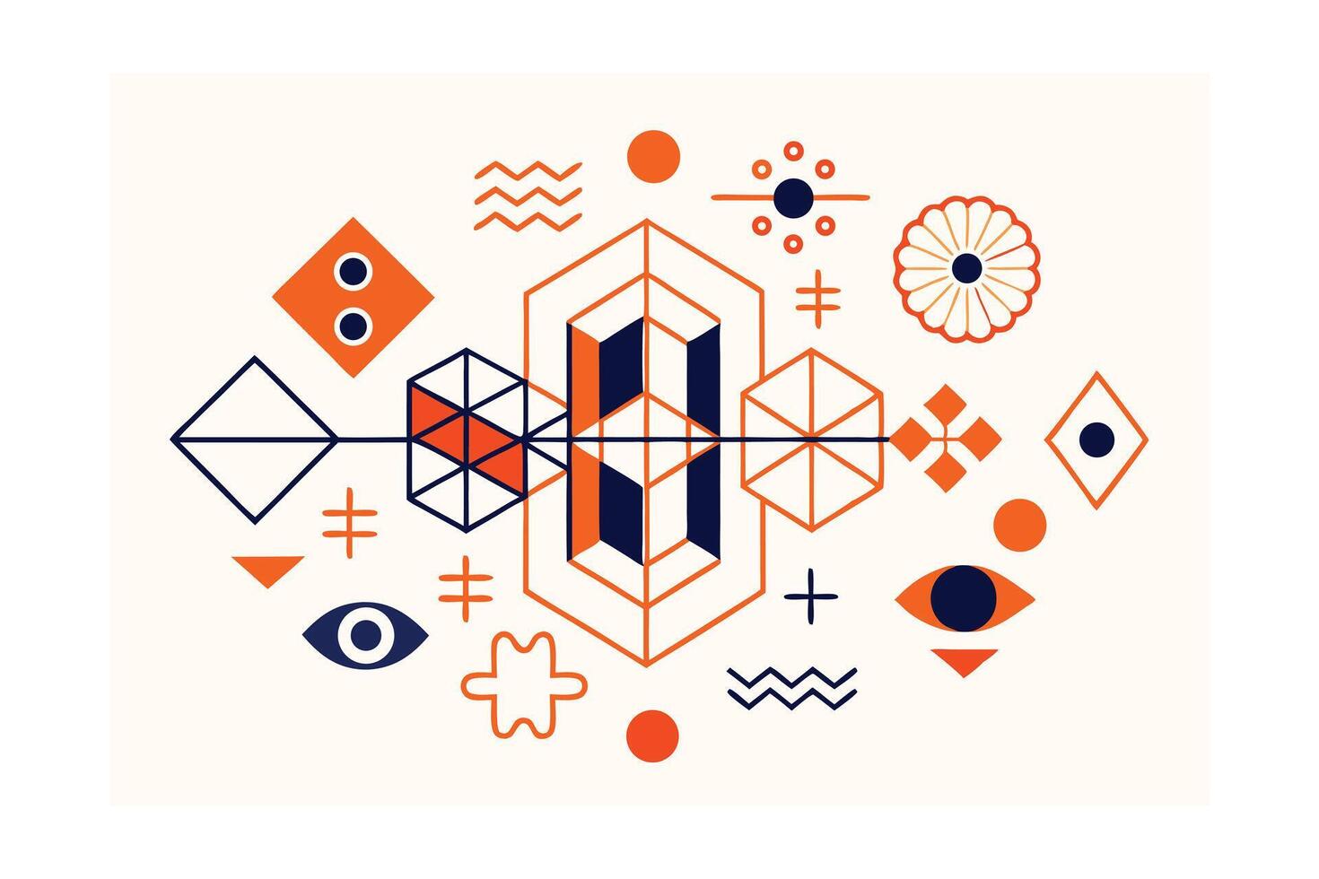 Geometric Composition Of Abstract Shapes In Orange And Navy Modern Minimalist Design Featuring Triangles Circles Squares Flowers And An Eye Pro Vector
