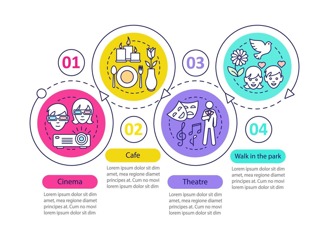 First date vector infographic template. Cinema, theater, cafe, park walk. Presentation. Data visualization with four steps and options. Process timeline chart. Workflow layout with linear icons Pro Vector