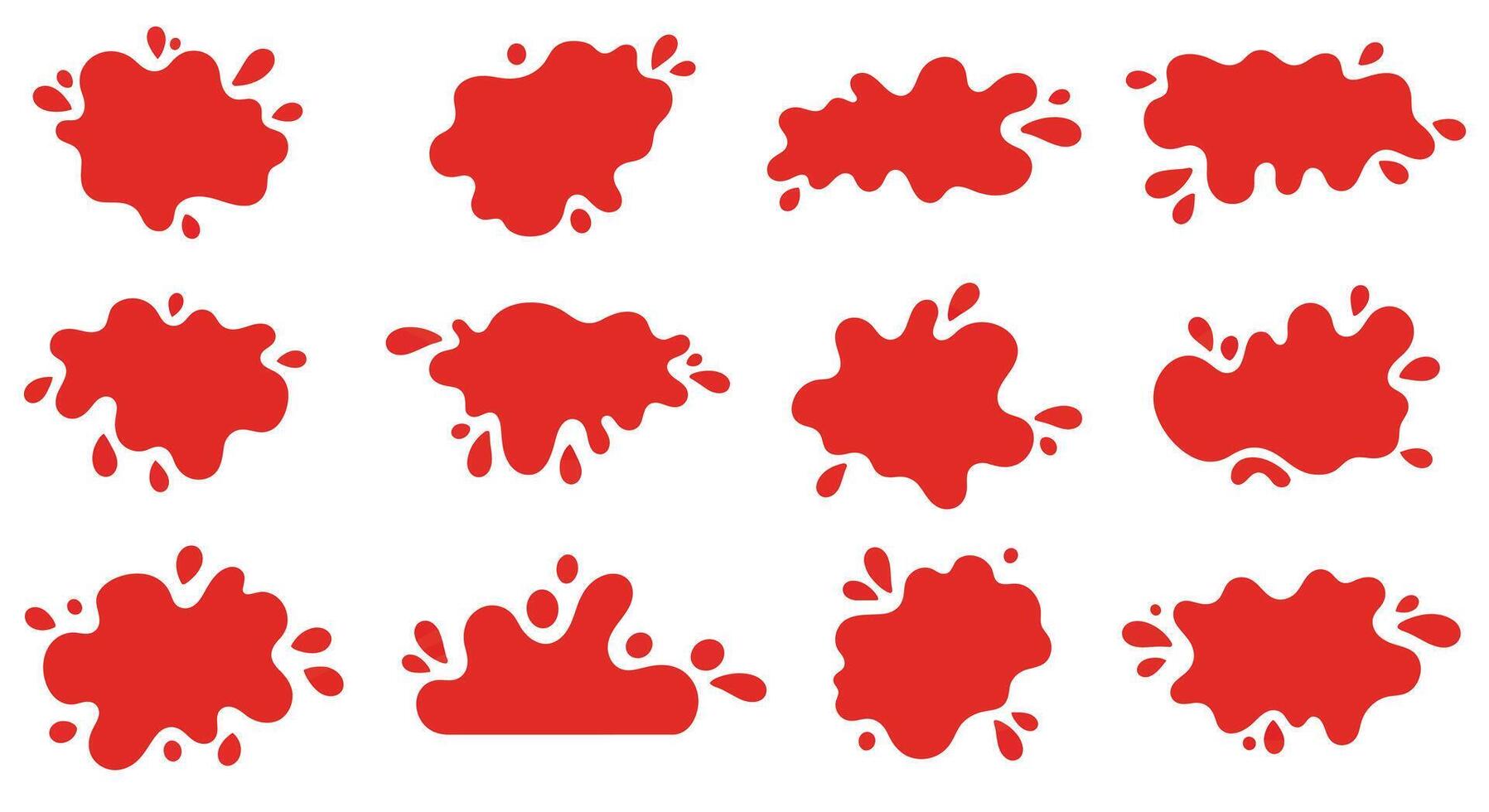 Red paint splatters collection in flat design style featuring various irregular shapes and sizes with scattered droplets art Pro Vector