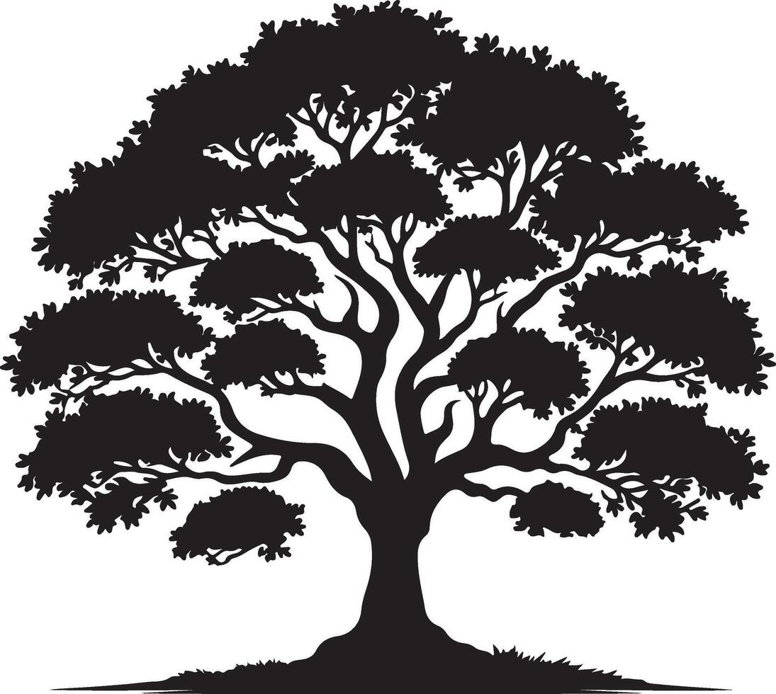 A detailed silhouette of a large deciduous tree with a full canopy and visible root system base vector