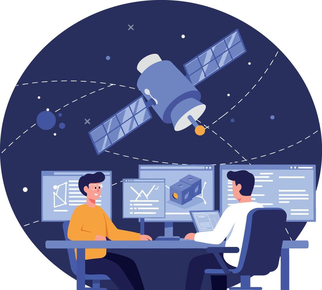 Two male engineers analyzing satellite data with multiple screens in modern flat design illustration Pro Vector