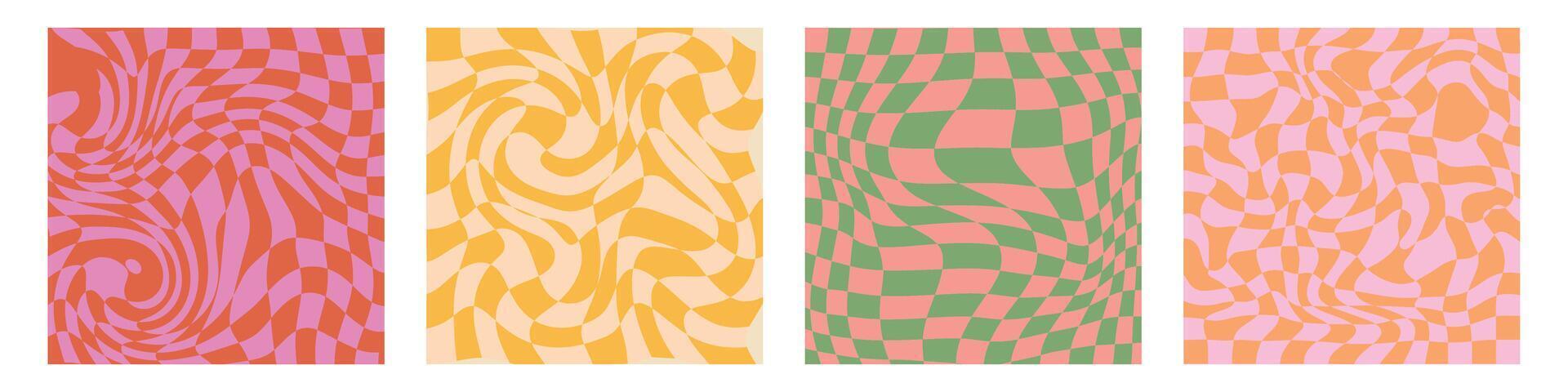 Groovy 70s hippie backgrounds featuring checkerboard,mesh, and wavy patterns.Retro 60s and 70s psychedelic design with a Y2K aesthetic. Pro Vector