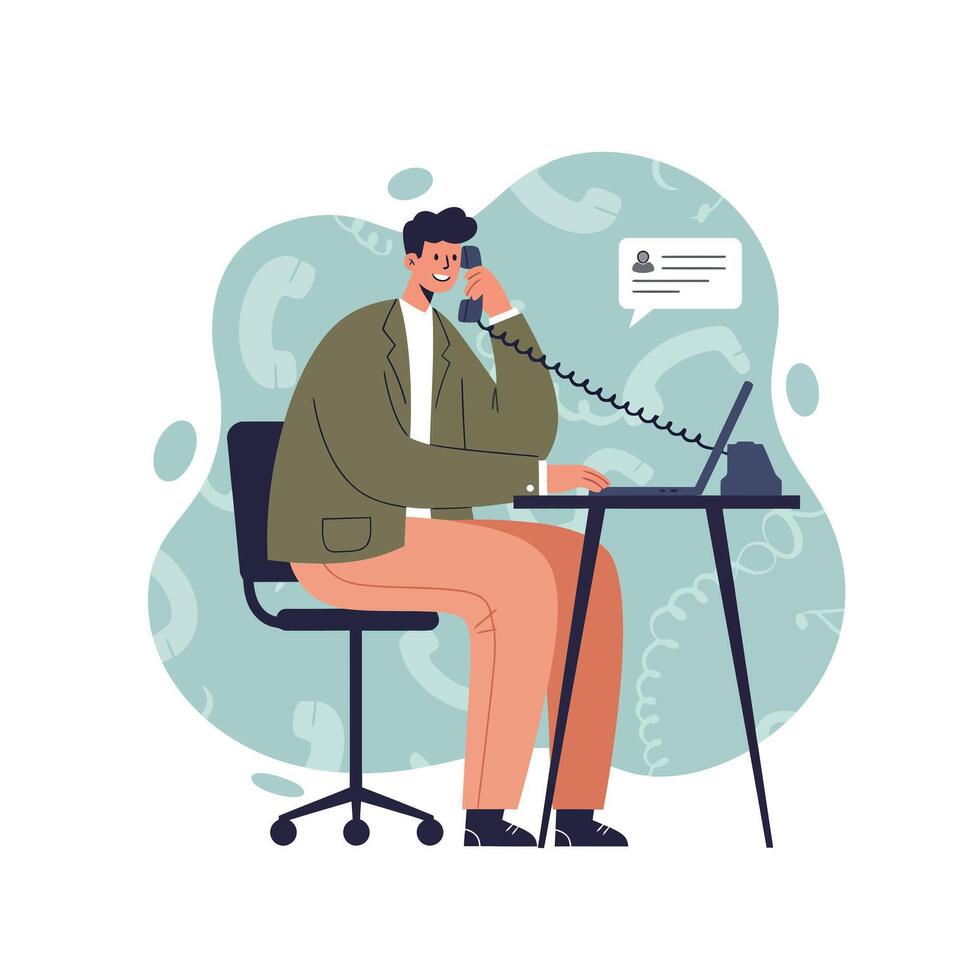Man using telephone while working on laptop in office setting with modern communication tools Pro Vector