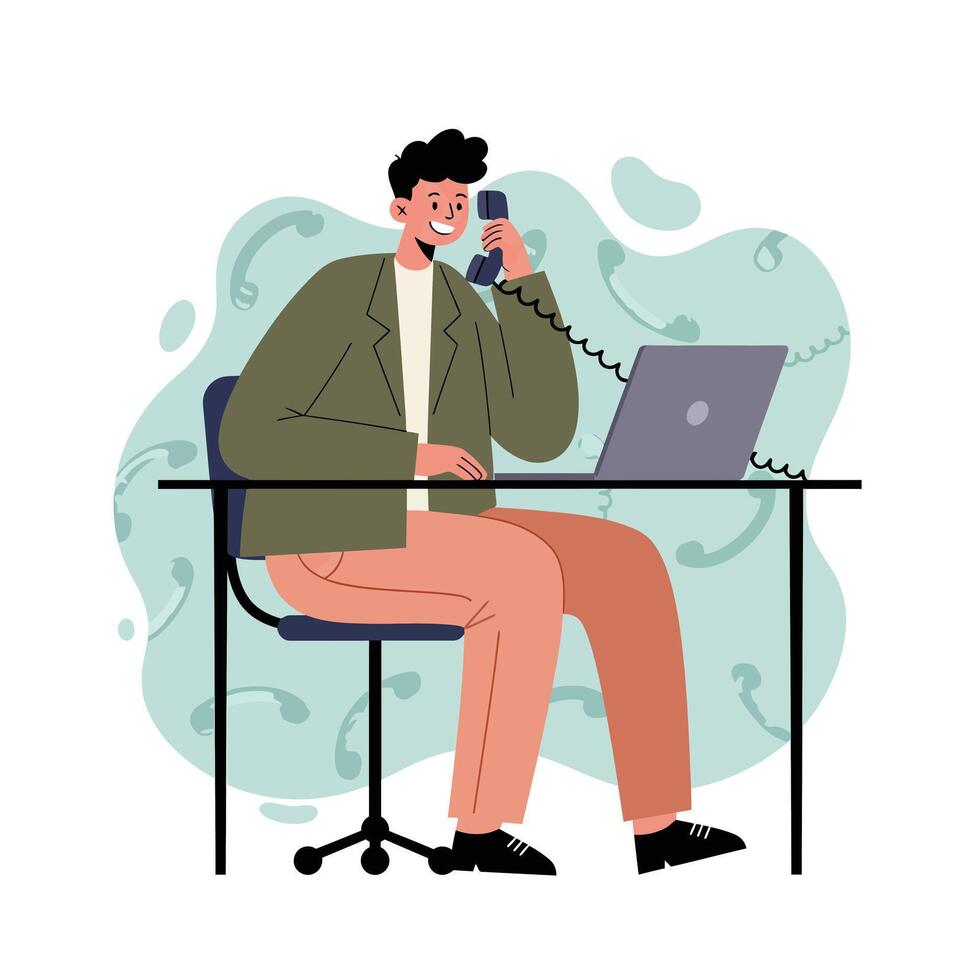 Man using desk phone and laptop in modern office setting with abstract green background Pro Vector