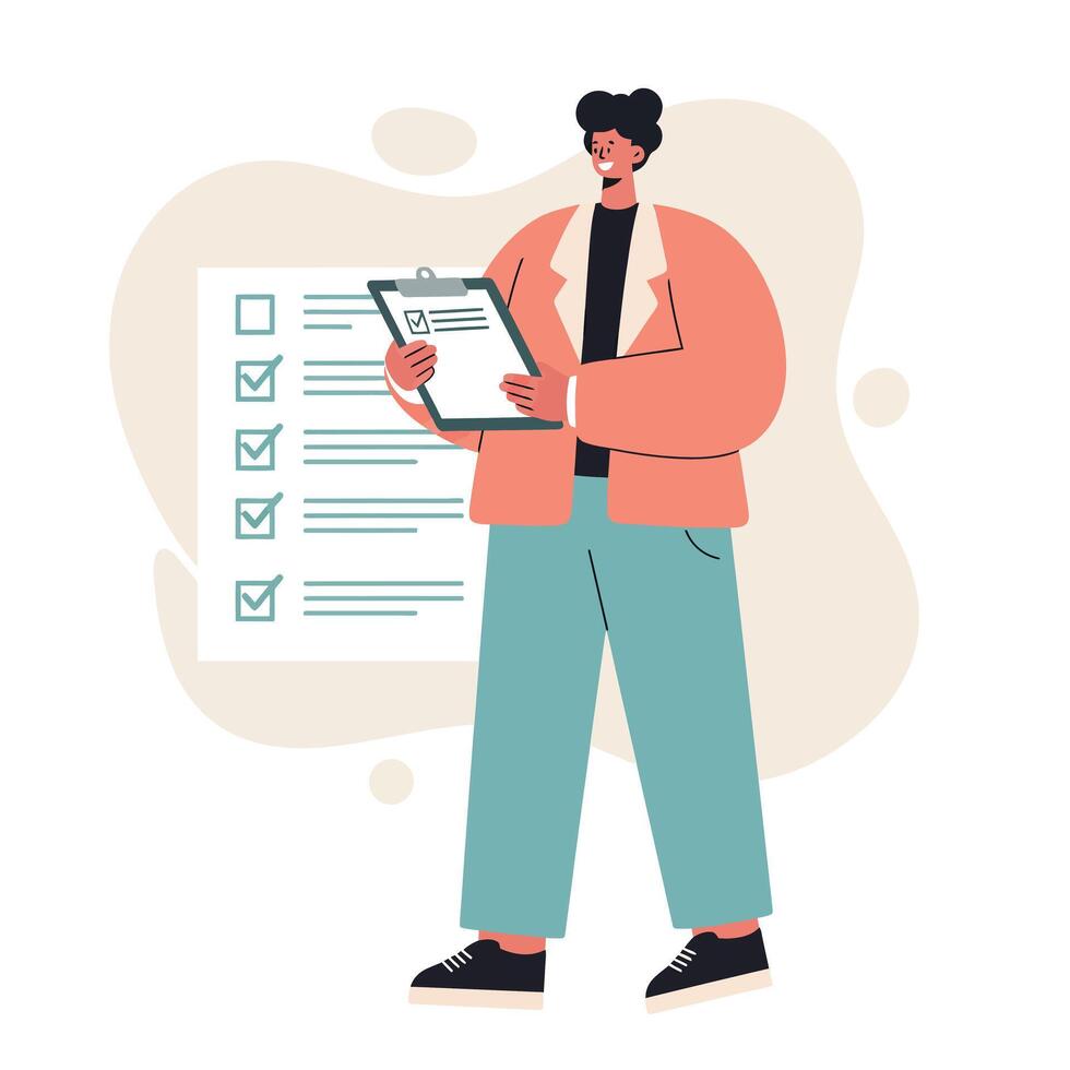 Young person standing with clipboard checking off tasks on large checklist in minimal style Pro Vector