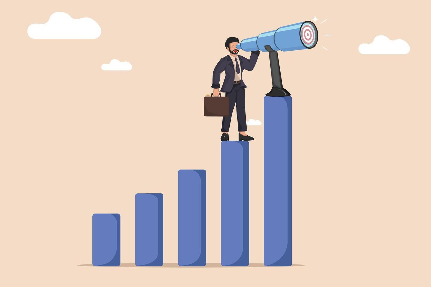 A determined businessman with a briefcase stands on rising graph bars, using a large telescope to focus on a distant target. Pro Vector