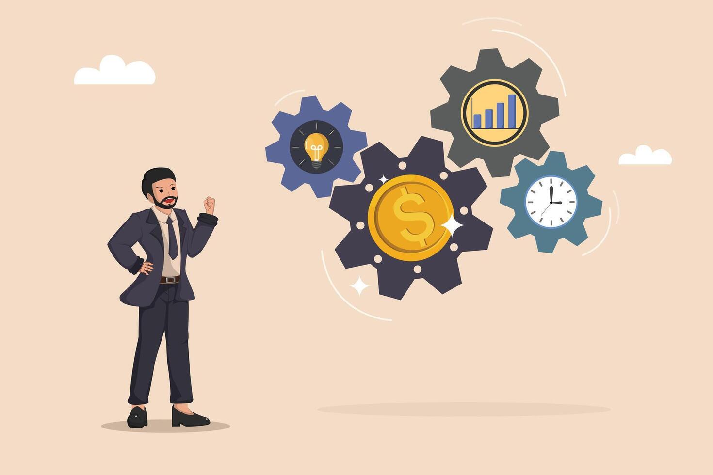 Businessman looking Interlocking Gears with Dollar Coin, Lightbulb, Bar Chart, and Clock Concept of Business Strategy and Financial Growth. Pro Vector