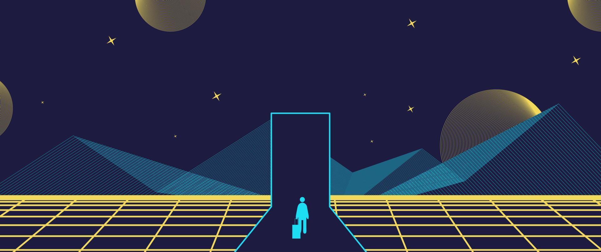 Businessman Start and Steps into Future Door. Moving Forward to New Technology, Blockchain and the Next Layer of the Internet Concepts. Futuristic Tone Pro Vector and Pro SVG
