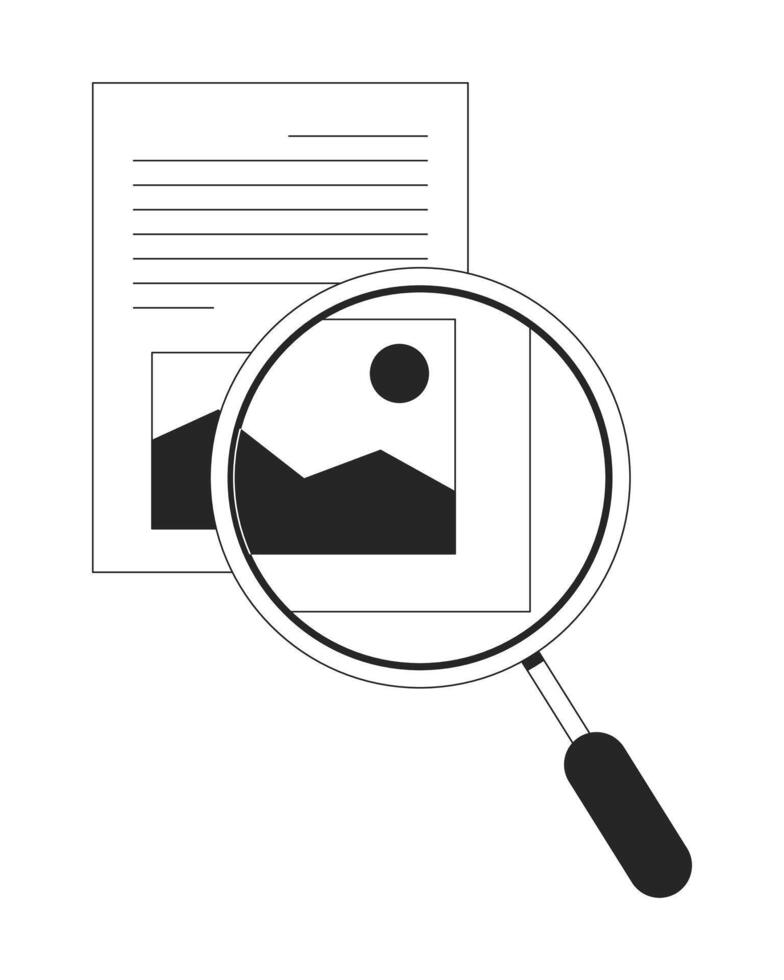 Taking closer look line onboarding ui illustration. Content verification. File analysis. Magnifying glass zooming in on document article outline 2D concept isolated. Ink linear metaphor art Pro Vector