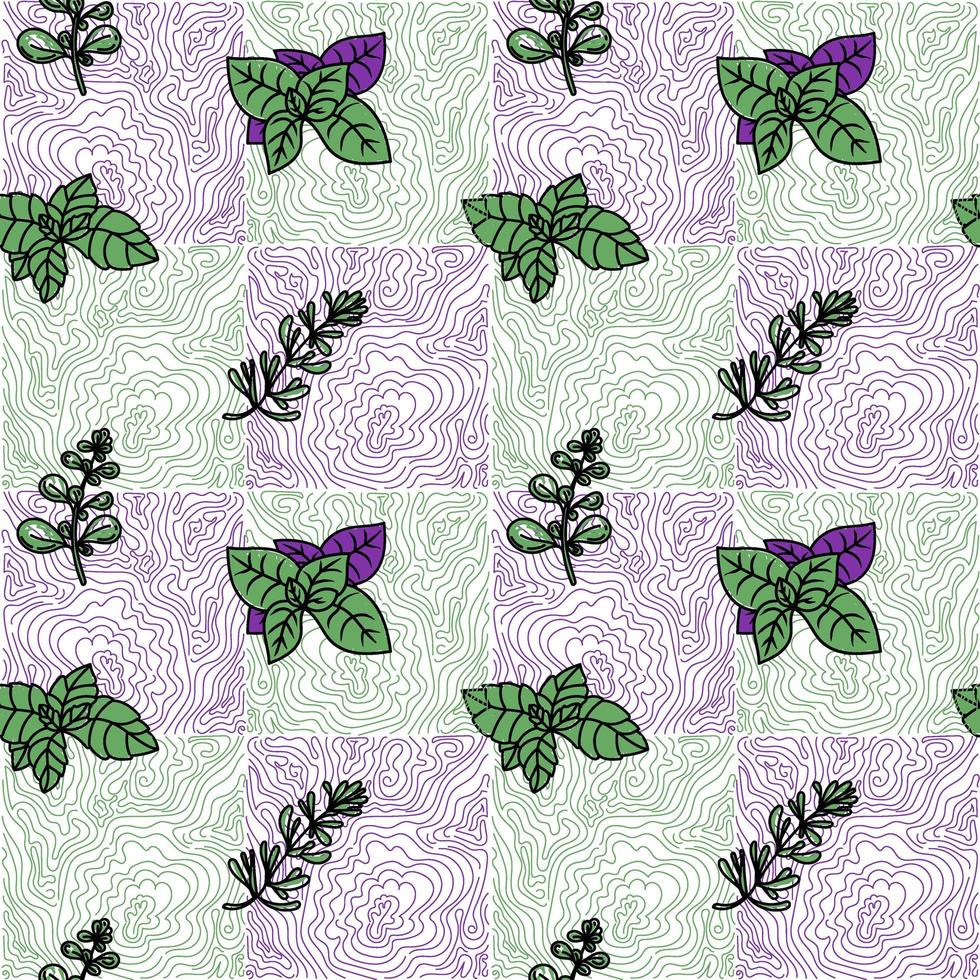 Seamless pattern of herbs, drawn element in doodle style. Herbs and spices - basil, melissa and rosemary on an abstract background. Pattern in a trendy linear style and green. Pro Vector