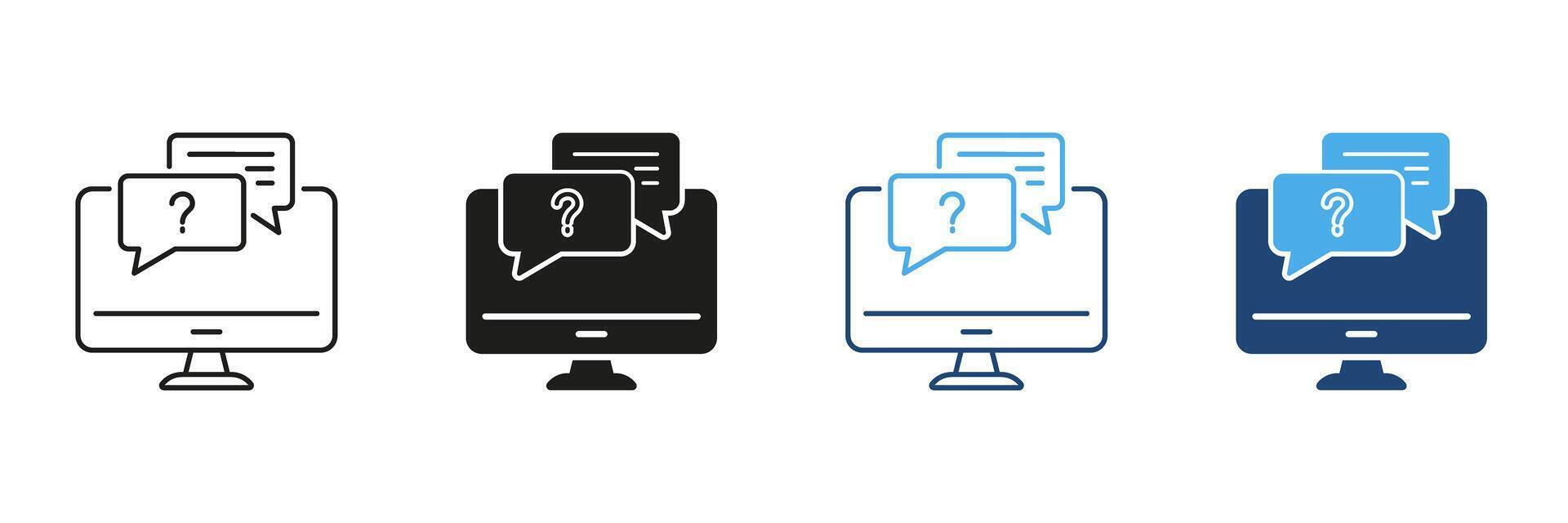 Computer With Chat Bubbles Icon Set. Online Support, Customer Service, And Communication Outline and Silhouette Symbol Collection. Digital Assistance And Help Desk. Isolated Illustration Pro Vector