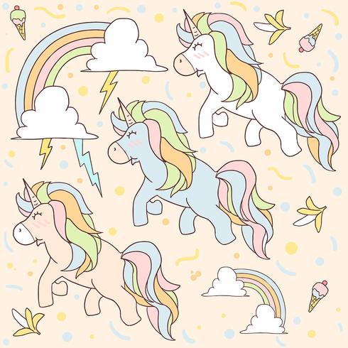 UNICORN PATTERN CUTE UNICORN FLYING WITH THUNDER AND RAINBOW Free Vector