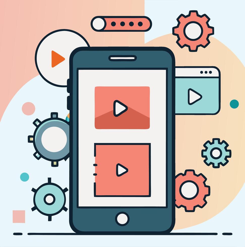 Mobile phone displaying interfaces is surrounded by gears on a soft background Pro Vector