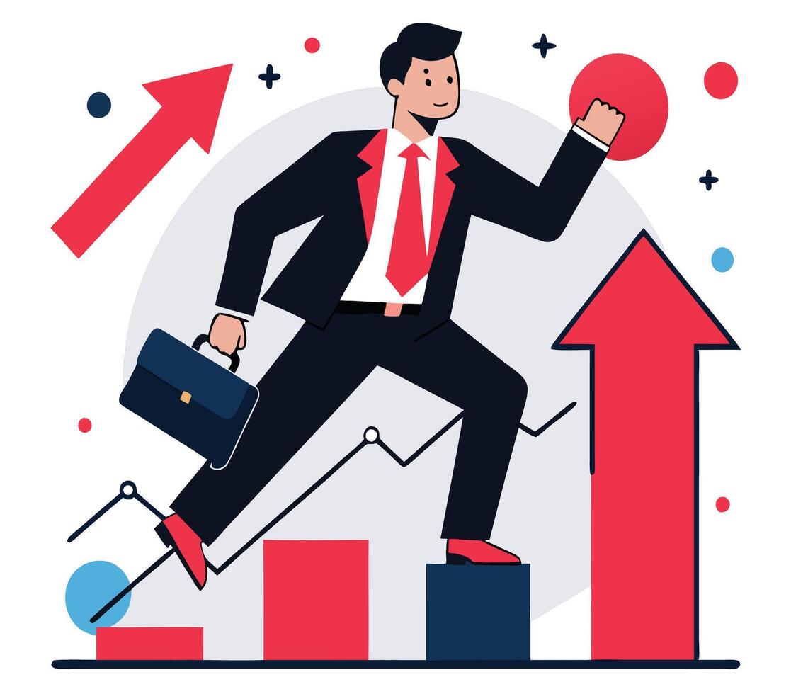 Determined man in suit climbs financial bar graph with briefcase in hand showing advancement Pro Vector