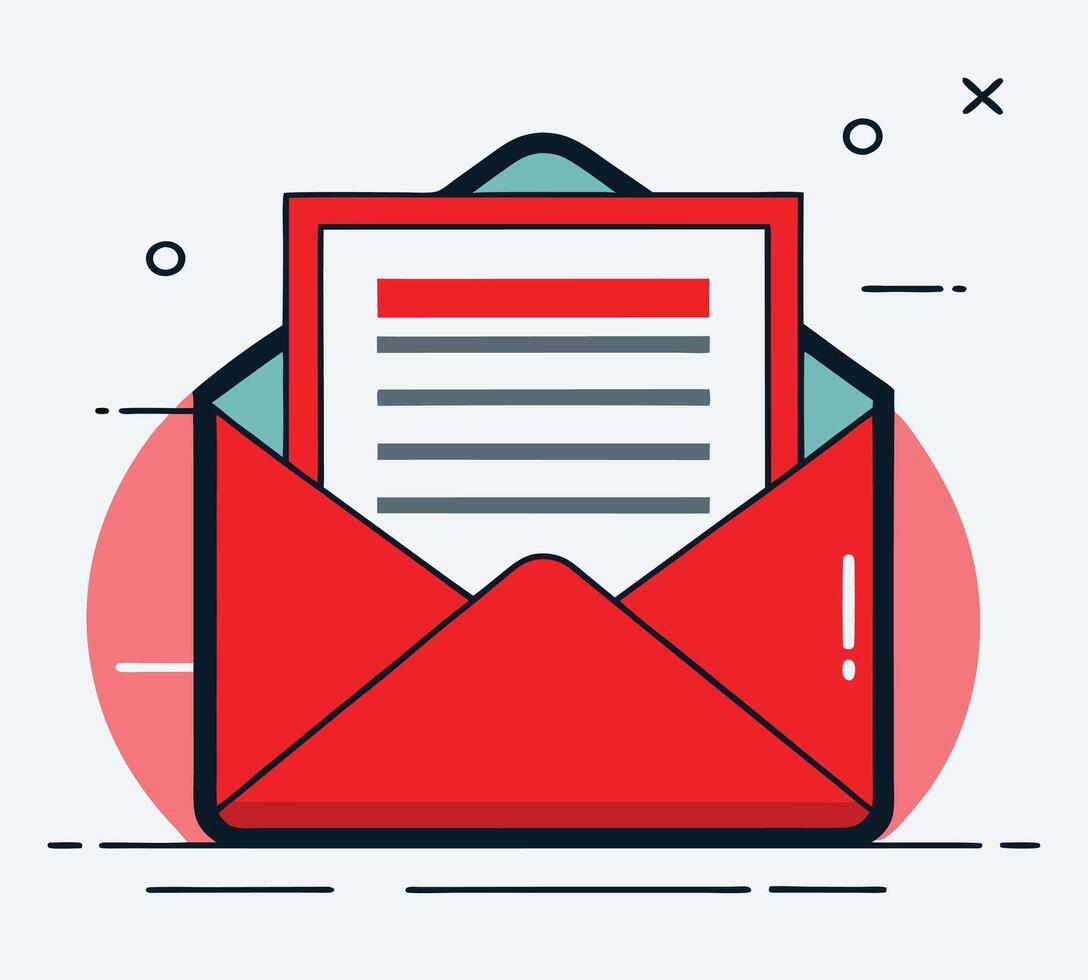 Open red envelope reveals a document with lines on white backdrop design Pro Vector