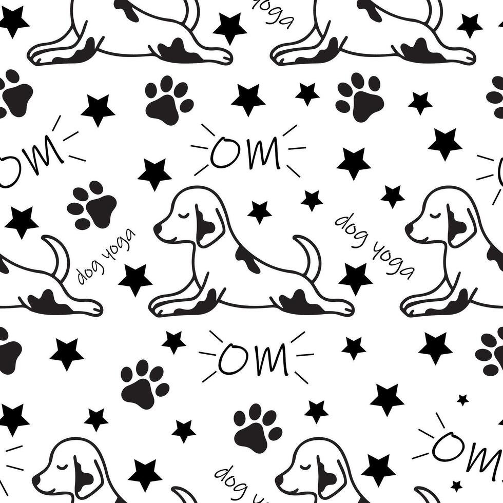 seamless pattern with a simple icon of a dog doing yoga, namely lying in the sphinx pose and various inscriptions, for logos and various designs Pro Vector