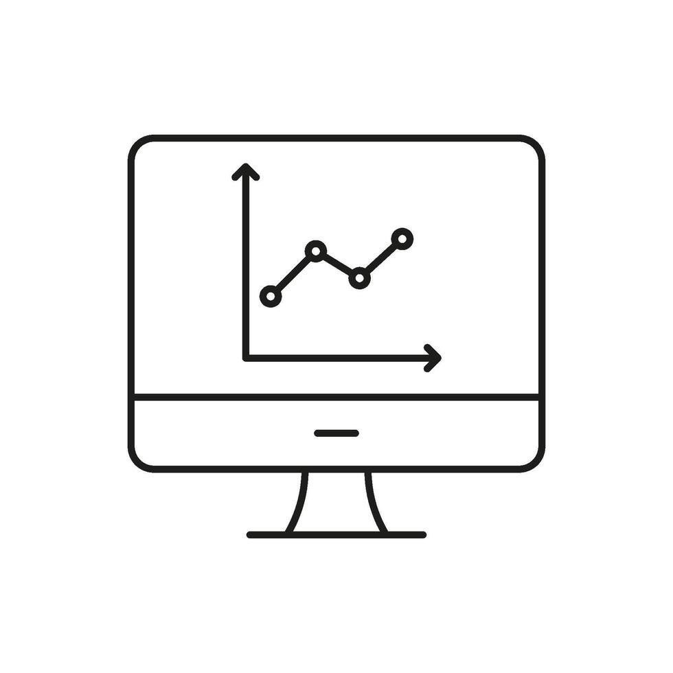 Computer Monitor With Graph Line Icon. Data Analysis, Business Analytics, And Performance Tracking Outline Symbol. Financial Insights And Market Trends. Editable Stroke. Isolated Illustration Pro Vector