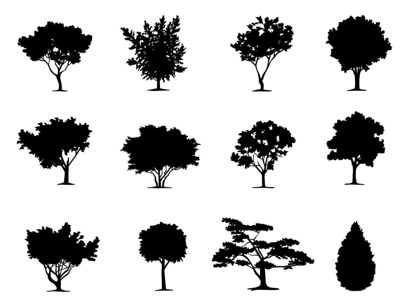 silhouette tree line drawing set, Side view, set of graphics trees elements outline symbol for architecture and landscape design drawing. illustration in stroke fill in white. Tropical Free Vector