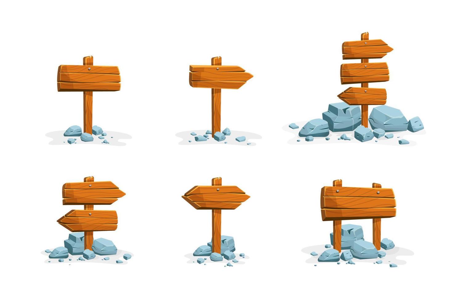 Set of Wooden signpost with stones with empty space for text. Set of a cartoon of wooden signs of various forms standing on the rocks. Vector illustration. Pro Vector