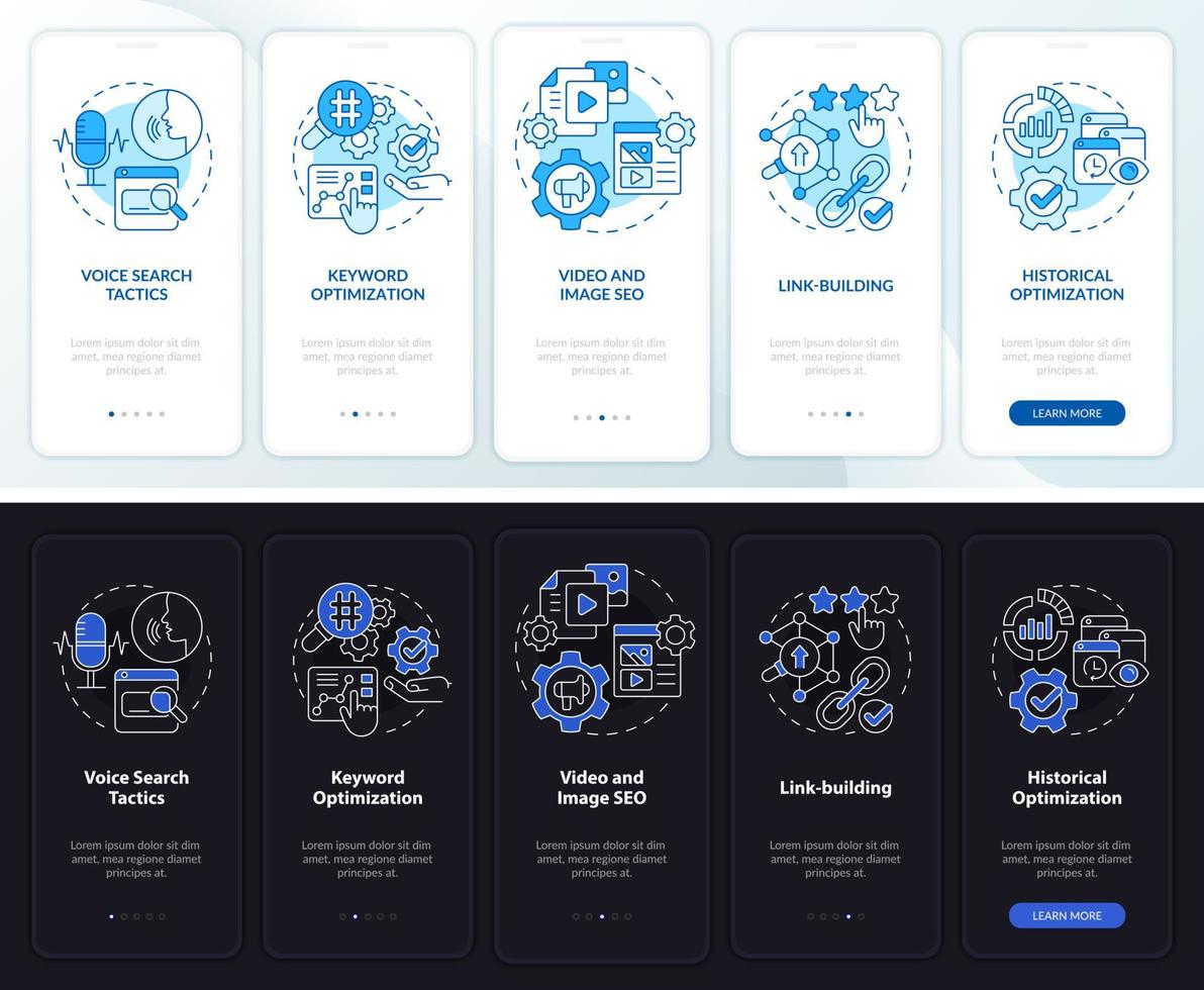 SEO marketing trends night and day mode onboarding mobile app screen. Walkthrough 5 steps graphic instructions pages with linear concepts. UI, UX, GUI template. Myriad Pro-Bold, Regular fonts used Pro Vector