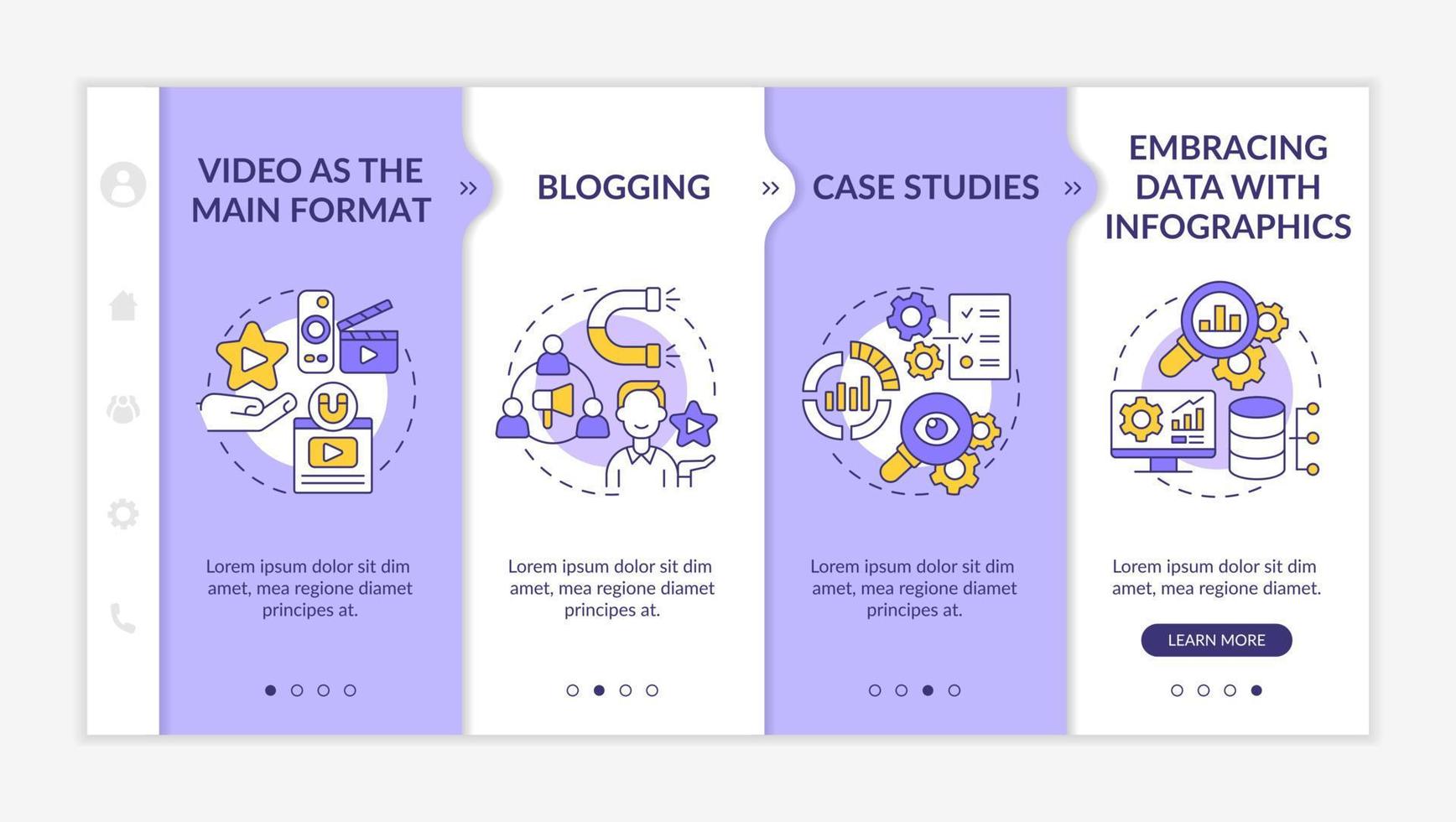 Content marketing trends purple and white onboarding template. Responsive mobile website with linear concept icons. Web page walkthrough 4 step screens. Lato-Bold, Regular fonts used Pro Vector