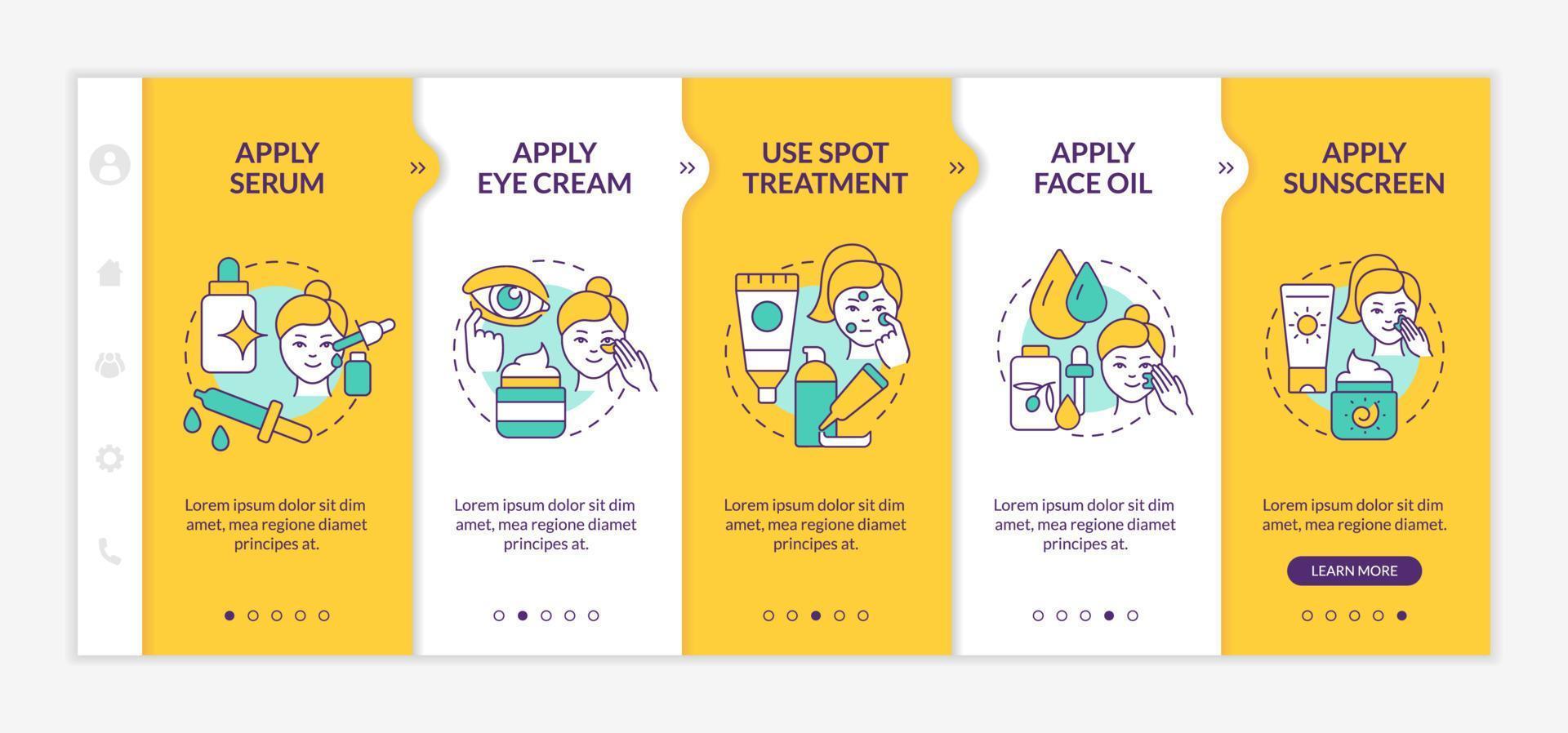 Skincare routine tips yellow onboarding template. Healthy skin. Responsive mobile website with linear concept icons. Web page walkthrough 5 step screens. Lato-Bold, Regular fonts used Pro Vector