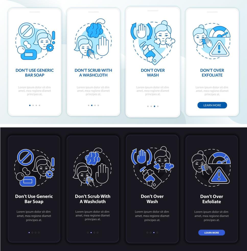 Skincare donts night and day mode onboarding mobile app screen. Care walkthrough 4 steps graphic instructions pages with linear concepts. UI, UX, GUI template. Myriad Pro-Bold, Regular fonts used Pro Vector