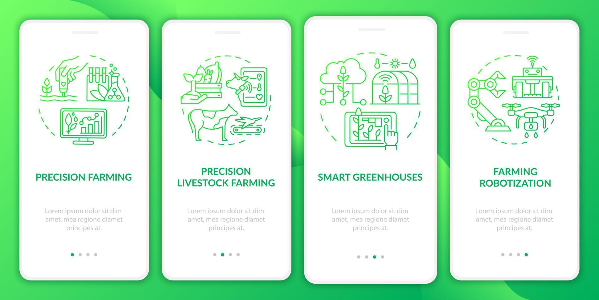 Precision agriculture green gradient onboarding mobile app screen. Walkthrough 4 steps graphic instructions pages with linear concepts. UI, UX, GUI template. Myriad Pro-Bold, Regular fonts used Pro Vector