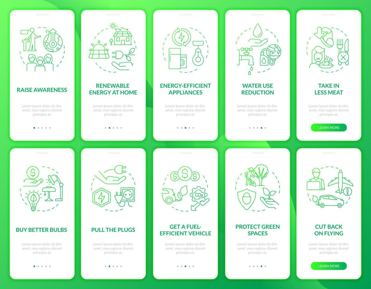 Avoid climate change green gradient onboarding mobile app screen set. Walkthrough 5 steps graphic instructions pages with linear concepts. UI, UX, GUI template. Myriad Pro-Bold, Regular fonts used Pro Vector