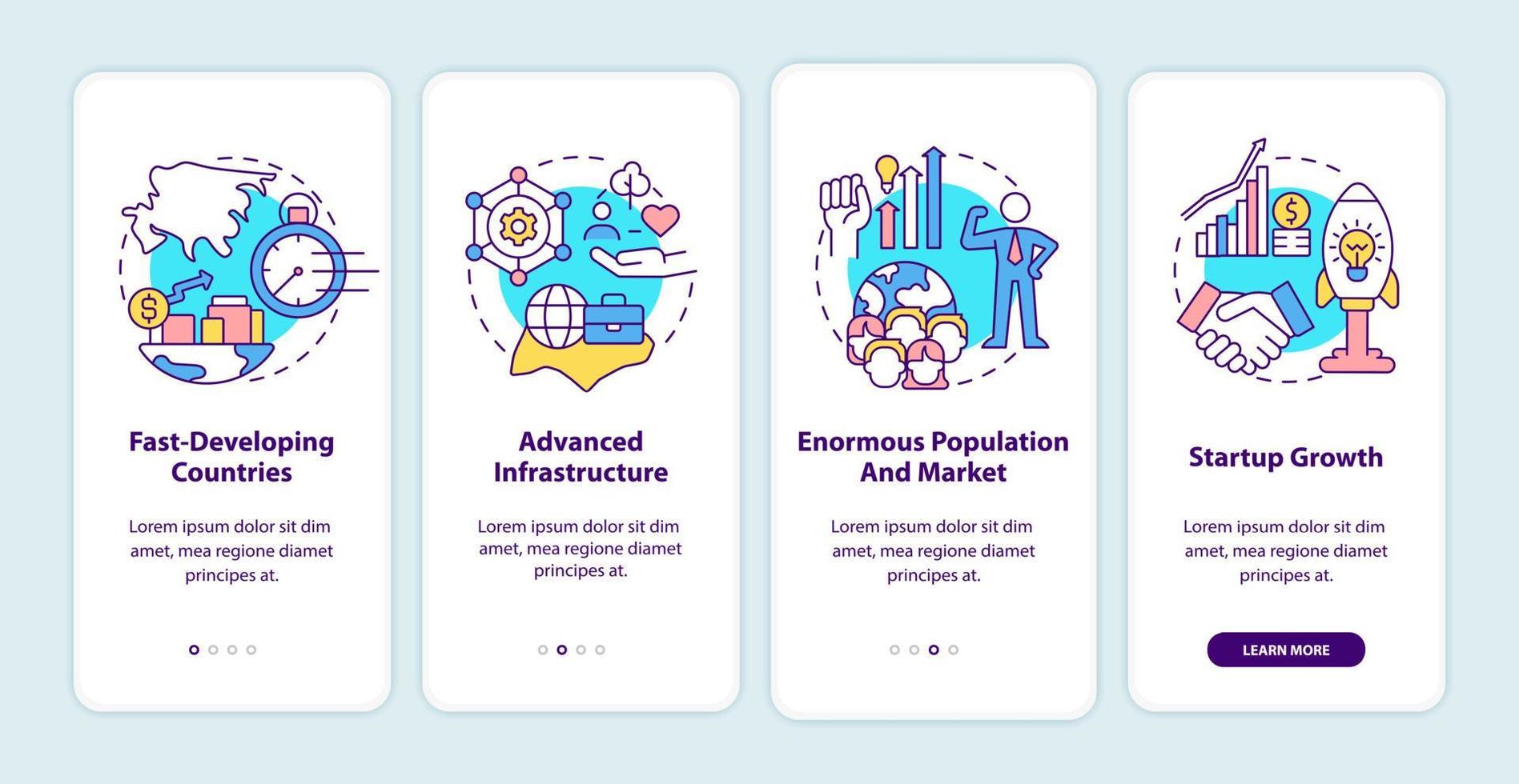 Reasons to move business to Asia onboarding mobile app screen. Walkthrough 4 steps graphic instructions pages with linear concepts. UI, UX, GUI template. Myriad Pro-Bold, Regular fonts used Pro Vector