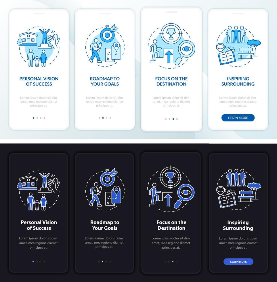 Happiness mind component light, dark onboarding mobile app page screen. Walkthrough 4 steps graphic instructions with concepts. UI, UX, GUI vector template with linear night and day mode illustrations Pro Vector