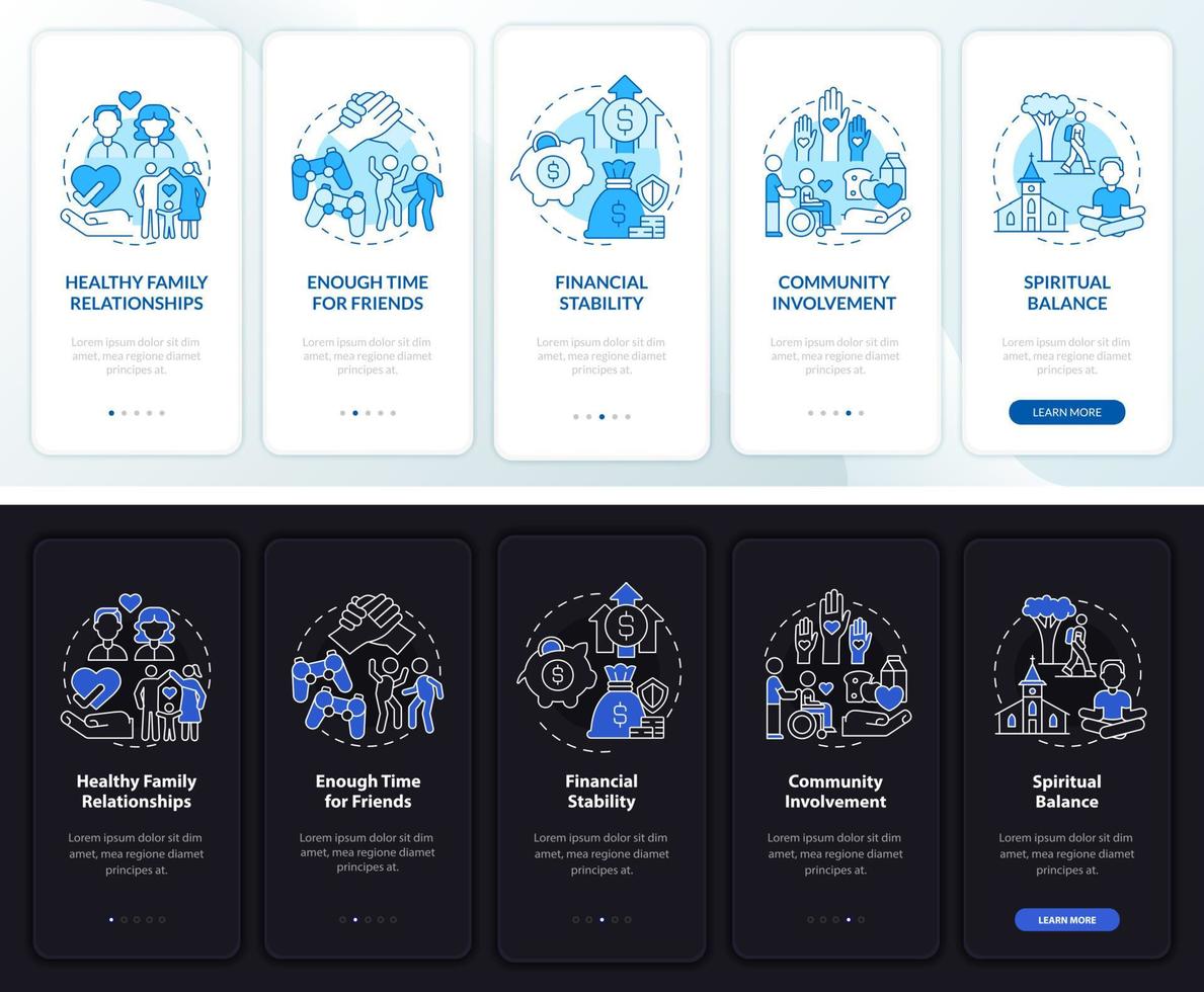 Balanced life signs night and day mode onboarding mobile app screen. Joy walkthrough 5 steps graphic instructions pages with linear concepts. UI, UX, GUI template. Myriad Pro-Bold, Regular fonts used Pro Vector