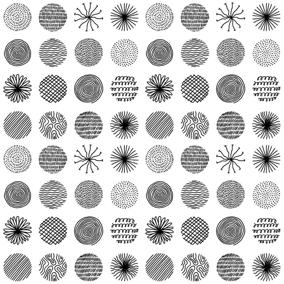 Hand drawn circles with doodle texture. Modern abstract seamless pattern with black organic round shapes with lines, circles, drops. Vector illustration on white background Pro Vector